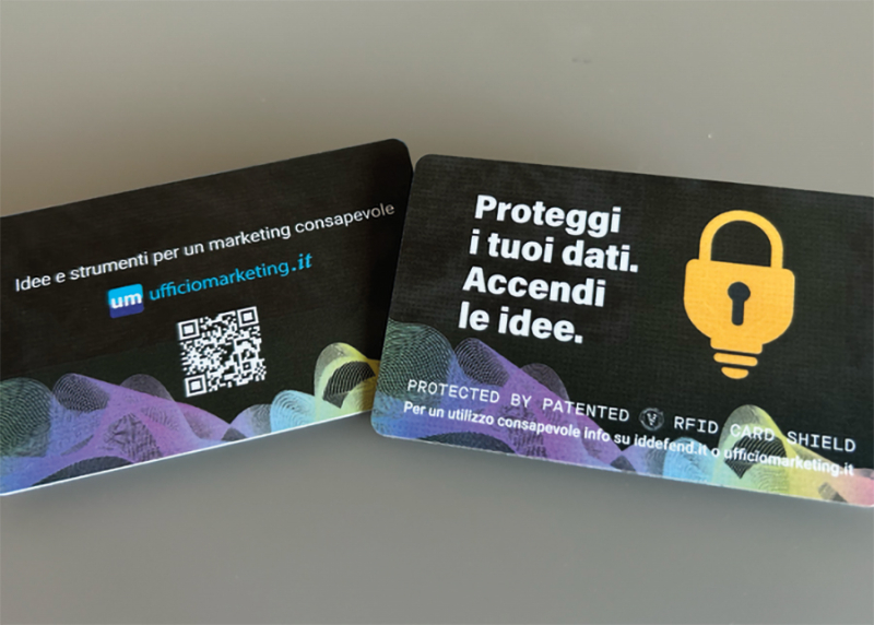 È il caso della recente iniziativa promossa da Ufficiomarketing.it: abbiamo scelto di personalizzare una speciale card schermante anti-frode, prodotta dall'azienda "ID Defend Srl" (LINK), con un duplice obiettivo: da un lato promuovere il blog e rafforzarne la riconoscibilità nel sito, dall’altro sensibilizzare le persone sui rischi legati alla cybersicurezza, anche nella vita quotidiana.
